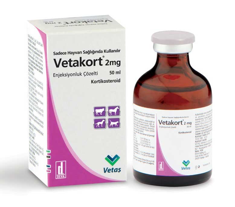 Vetakort  Injectable Solution contains sodium ester of dexamethasone; this active substance is the fluoro-methyl derivative of prednisol, a strong glucocorticoid with minimal mineralocorticoid activity. Dexamethasone has 10-20 times more anti-inflammatory effect than prednisone.